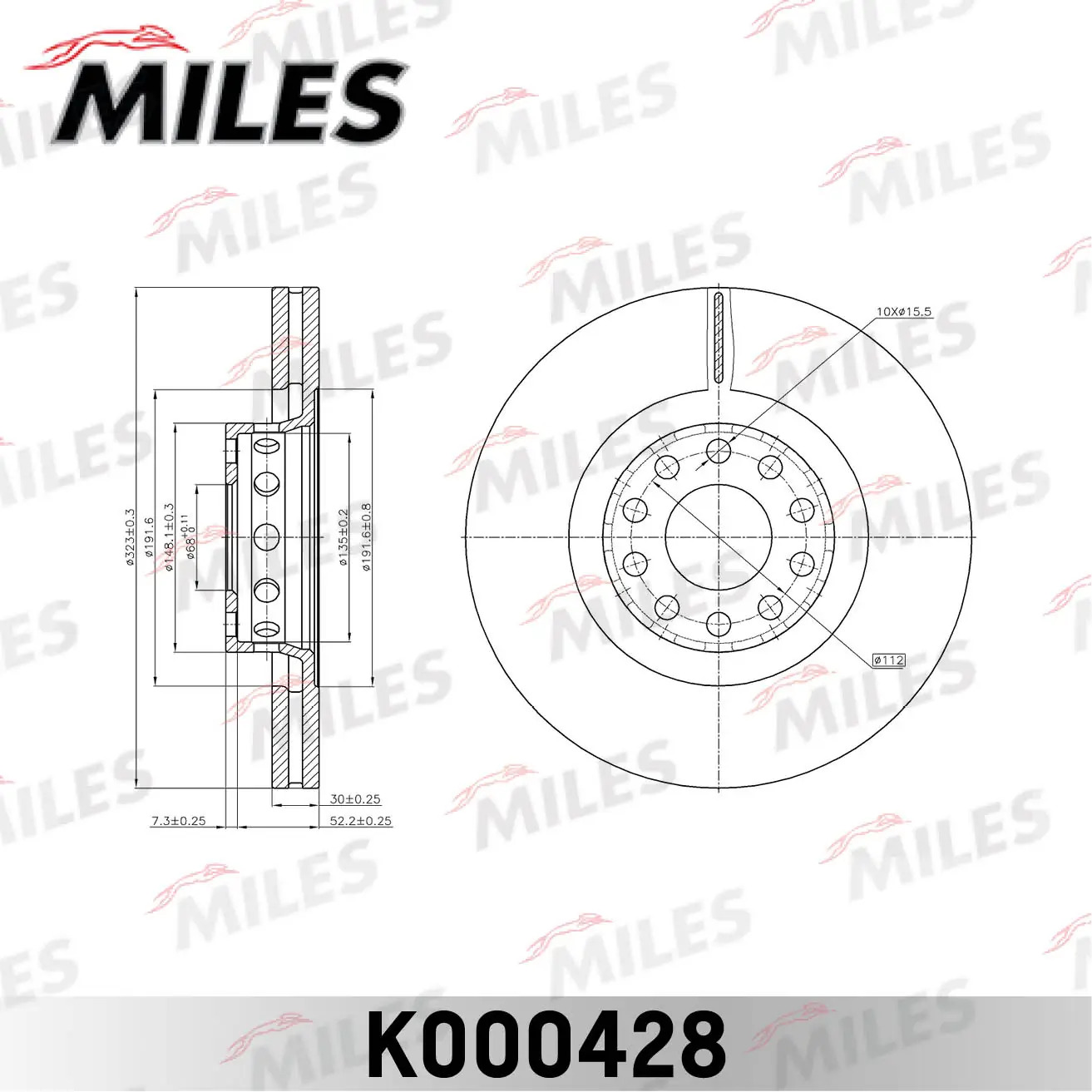 K000428 MILES Диск тормозной передний D323мм. AUDI A8 2.5-6.0 94-10/VW PHAETON 3.2 02- (TRW DF