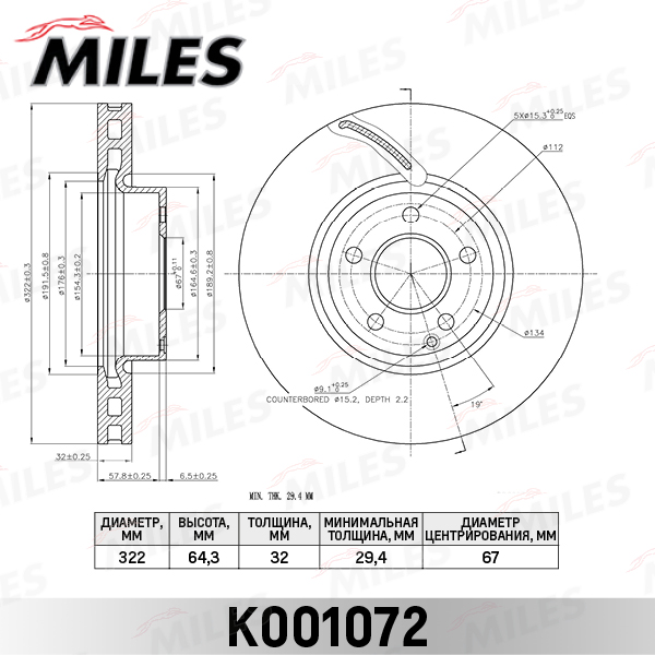 K001072 MILES Диск тормозной передний D322мм. MERCEDES W204 07-/W212 09- (TRW DF6195S) K001072