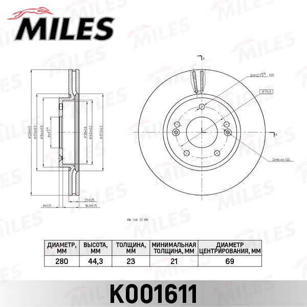 K001611 MILES Диск тормозной передний D280мм KIA CEED 12-/HYUNDAI i30 R15 11- (TRW DF8056) K00