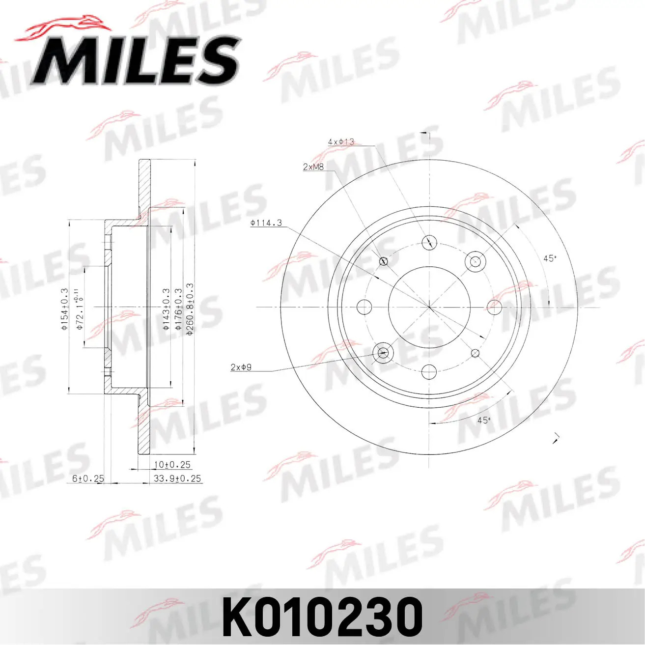K010230 MILES Диск тормозной задний D261мм. KIA CARENS 00-/CLARUS 96- (TRW DF4083) K010230