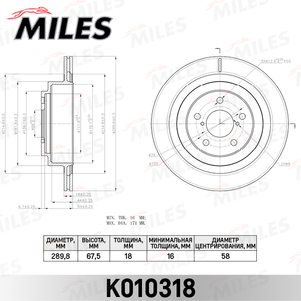 K010318 MILES Диск тормозной задний D290мм. SUBARU IMPREZA 00-/LEGACY 03-/OUTBACK 03-09 (TRW D