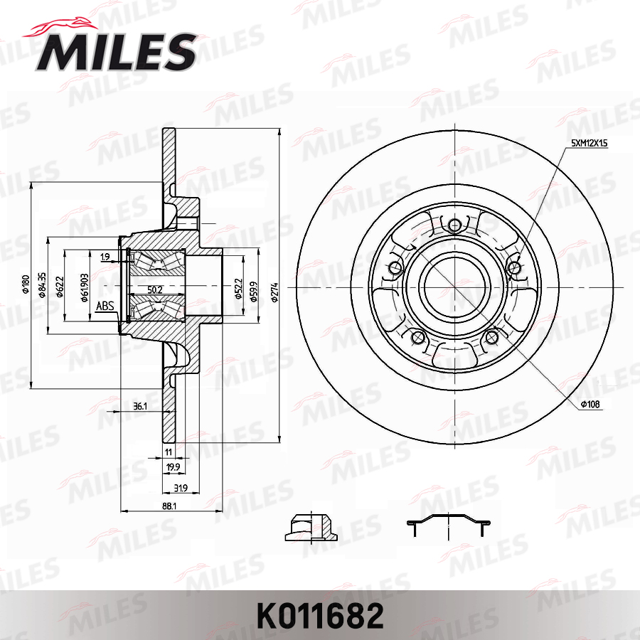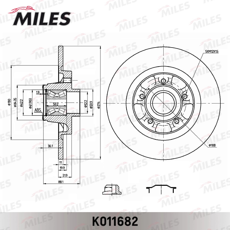 K011682 MILES Диск тормозной задний с подшипником, с кольцом ABS RENAULT KANGOO 08- K011682
