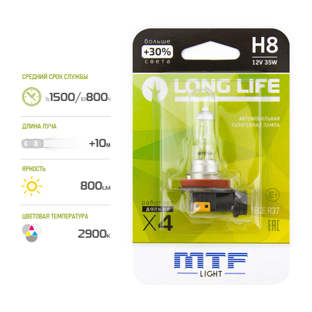 | Наименование | Лампа 12V H8 35W PGJ19-1 +30% блистер (1шт.) Long Life MTF |