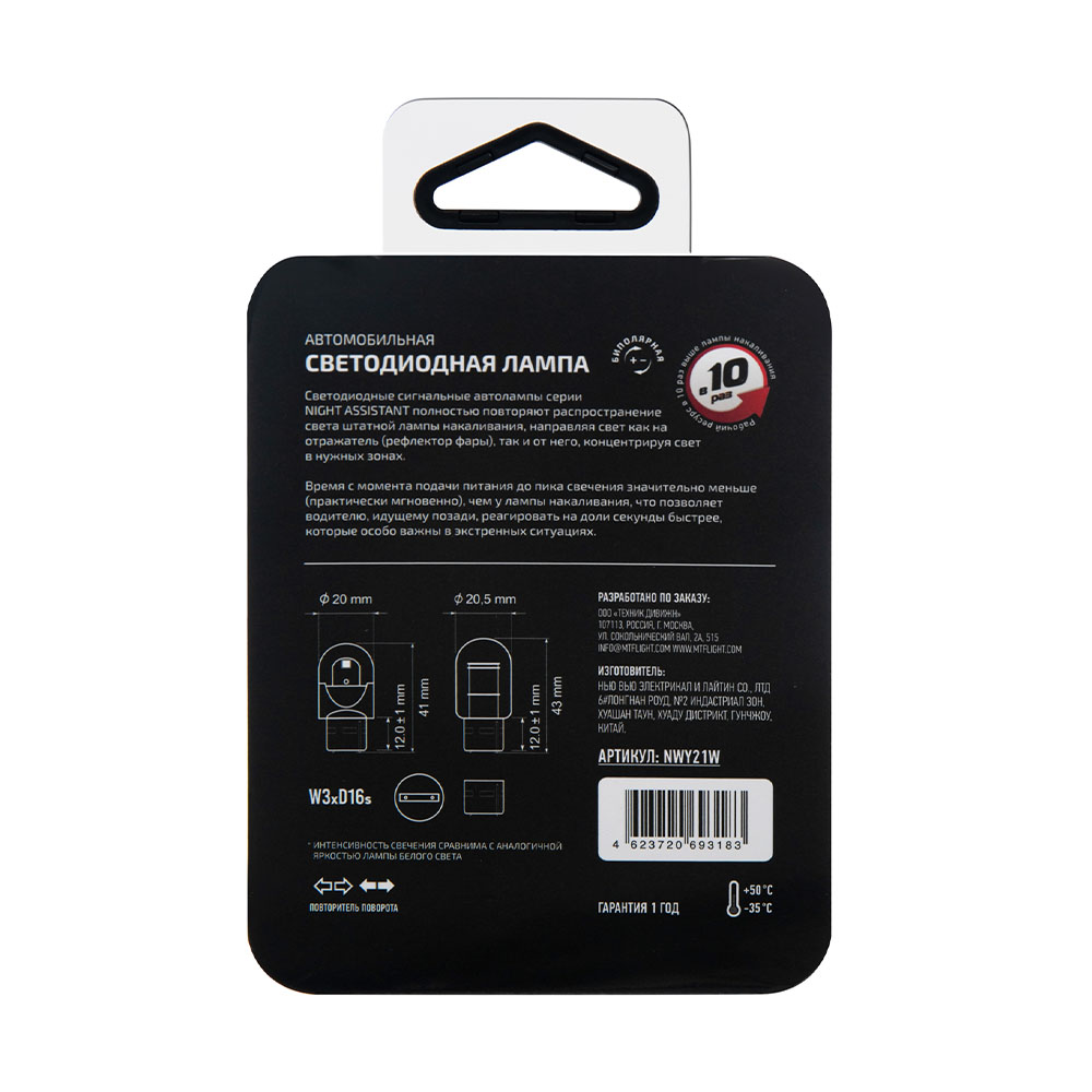 | Наименование | Лампа светодиодная 12V WY21W W3x16d блистер (1шт.) MTF |