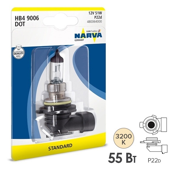 480064000 NARVA Лампа 12V HB4(9006) 51W P22d блистер (1шт.) Standard NARVA