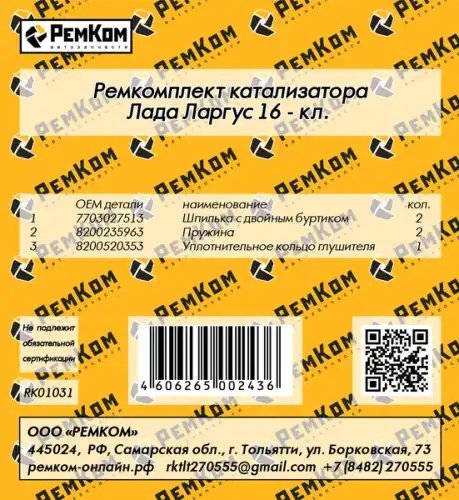 | Наименование | Ремкомплект катализатора Лада Ларгус 16-кл. РЕМКОМ RK01031 |