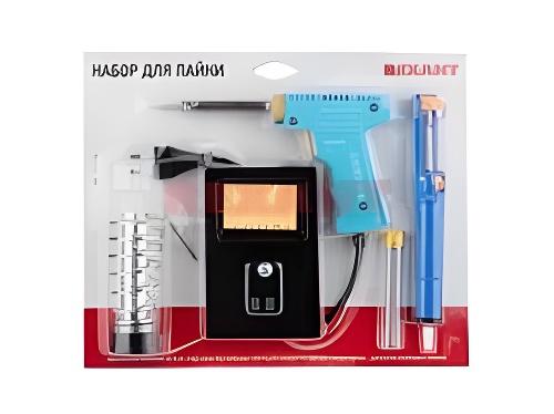 | Наименование | Набор для пайки (паяльник импульсный 30/70Вт,оловоотсос,подставка,припой) REXANT |