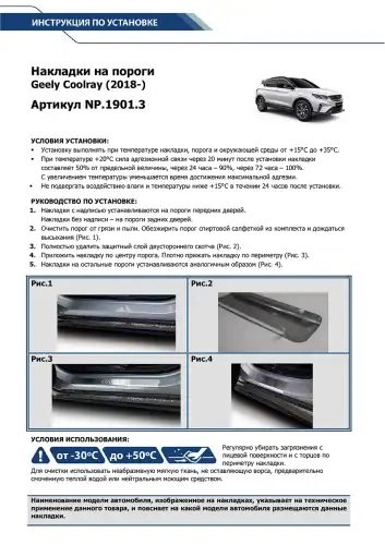 | Наименование | NP.1901.3 Накладки порогов (4 шт.) Geely Coolray 2018-, Belgee X50 2023- |