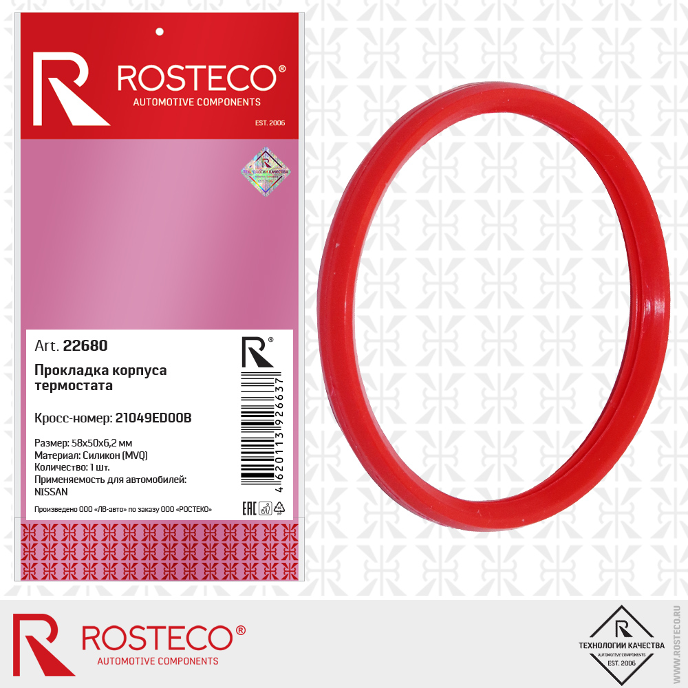 22680 ROSTECO Кольцо 50x58х6,2 уплотнительное корпуса термостата NISSAN, силикон MVQ 22680