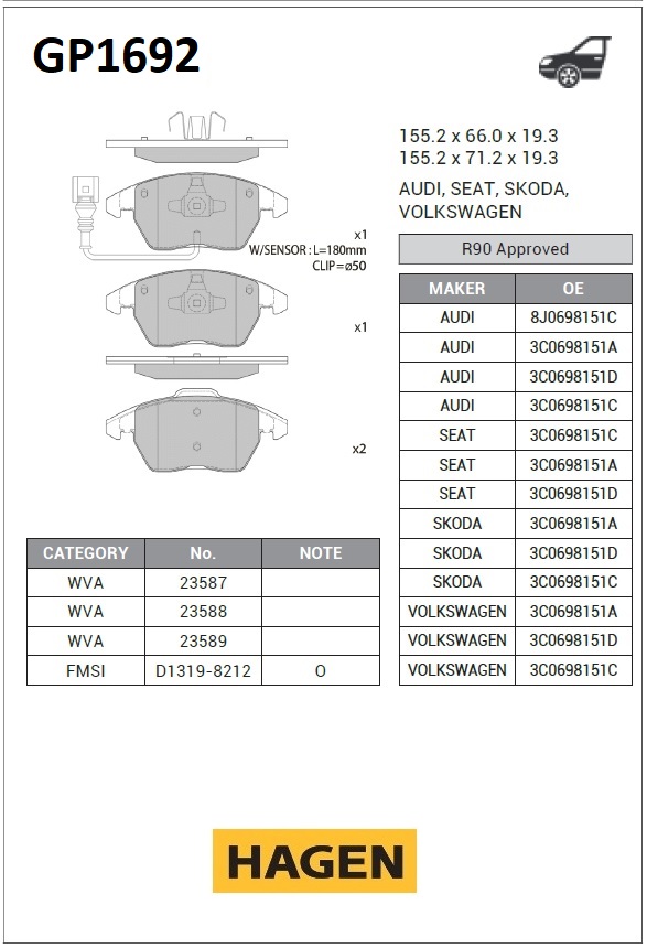 GP1692 SANGSIN Колодки тормозные VW Passat (05-) SKODA Octavia (04-) передние (4шт.) HAGEN SANG