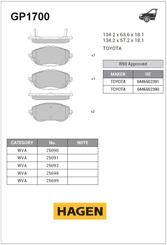 GP1700 SANGSIN Колодки тормозные TOYOTA Corolla (13-) передние (4шт.) HAGEN SANGSIN