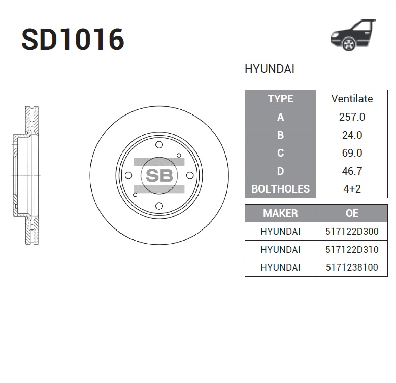 SD1016 SANGSIN Диск тормозной HYUNDAI ELANTRA 00-/LANTRA/MATRIX 01-/KIA CERATO 1.6 06- передний