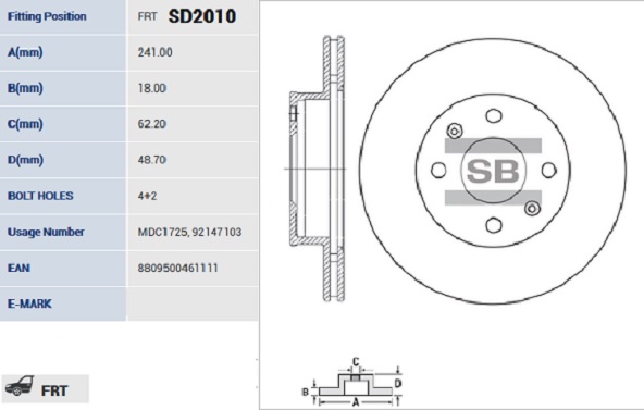 SD2010 SANGSIN Диск тормозной HYUNDAI i10 1.1 08-/KIA PICANTO 1.0-1.1 04- передний вент.D 241мм