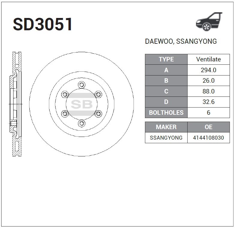 SD3051 SANGSIN Диск тормозной SSANGYONG Rexton (02-) передний (вентилируемый) (1шт.) SANGSIN