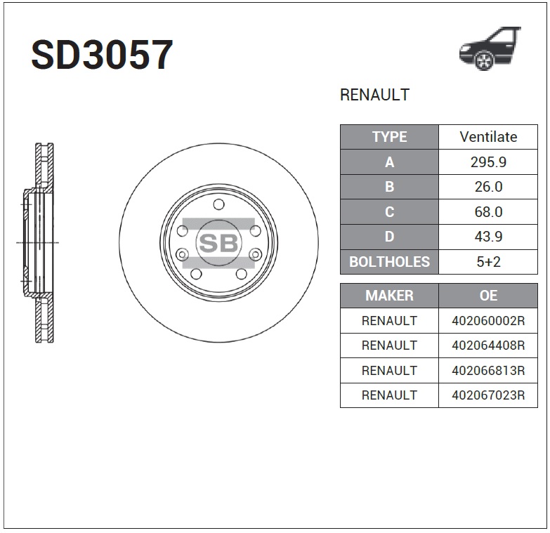 SD3057 SANGSIN Диск тормозной RENAULT Laguna 3 (07-) передний (1шт.) SANGSIN