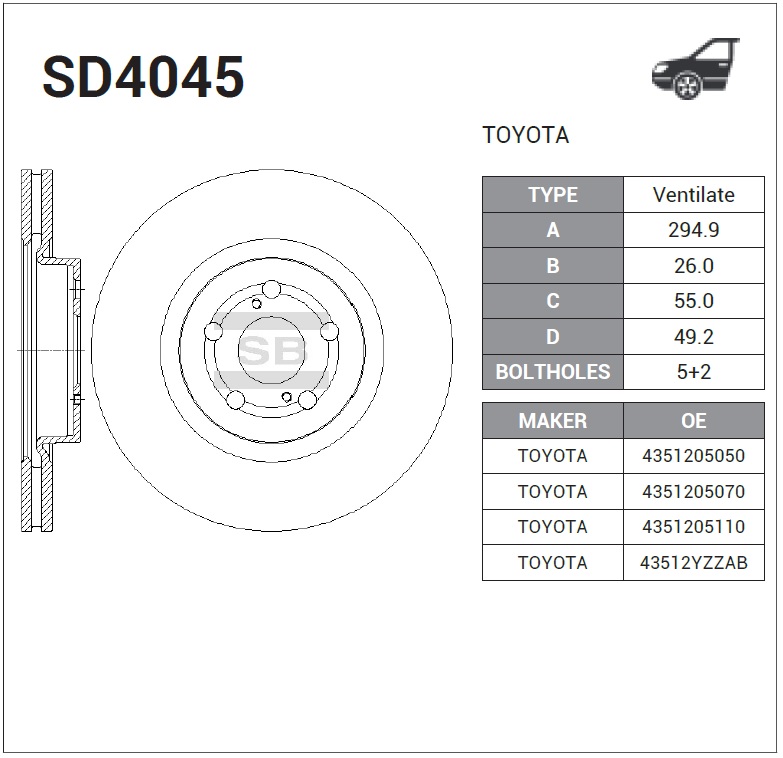 | Наименование | Диск тормозной передний TOYOTA AVENSIS T25 SD4045 |