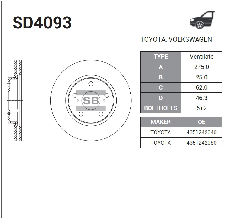 SD4093 SANGSIN Диск тормозной TOYOTA Rav 4 (06-) передний (1шт.) SANGSIN