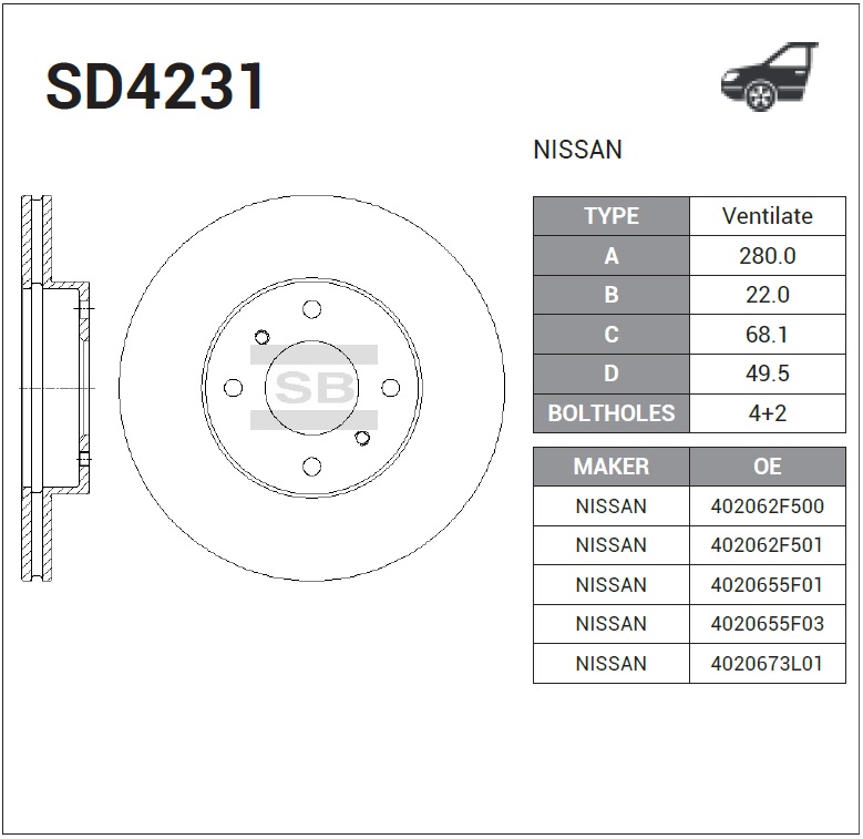 SD4231 SANGSIN Диск тормозной NISSAN Almera (N16),Primera (P11) передний с АБС (1шт.) SANGSIN