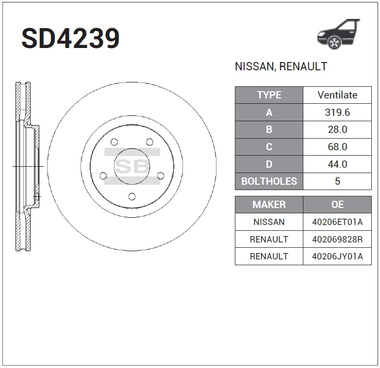 SD4239 SANGSIN Диск тормозной NISSAN QASHQAI 07-/RENAULT KOLEOS 08- передний вент.D 320мм. SD42