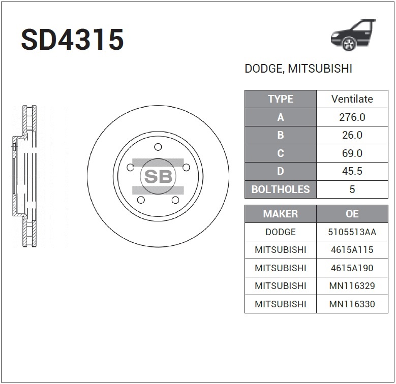 SD4315 SANGSIN Диск тормозной MITSUBISHI LANCER 08-/DODGE CALIBER 06- передний вент.D 276мм. SD