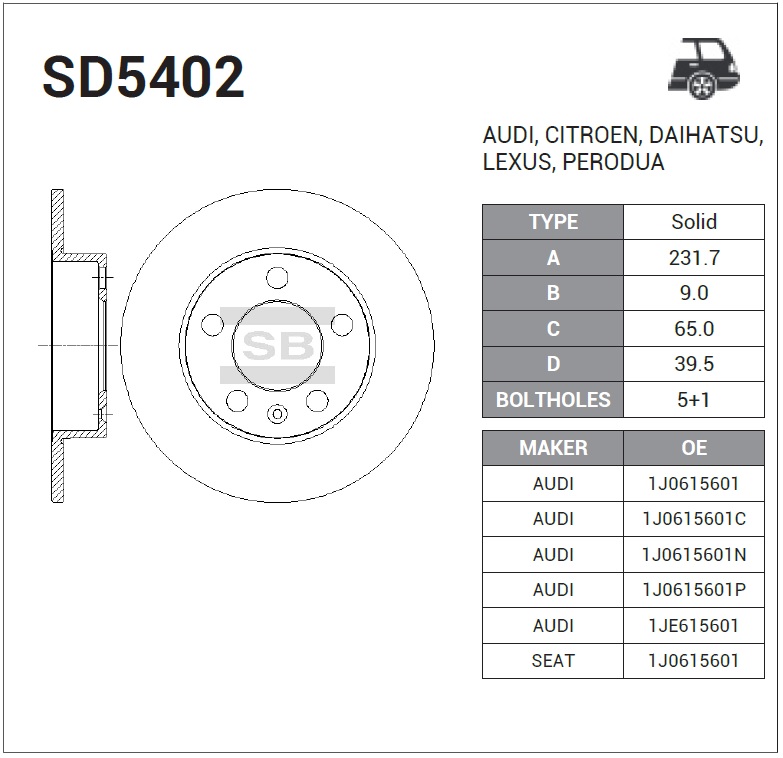 SD5402 SANGSIN Диск тормозной VW Golf,Polo (02-) AUDI A3 (97-03) R15 задний (1шт.) SANGSIN