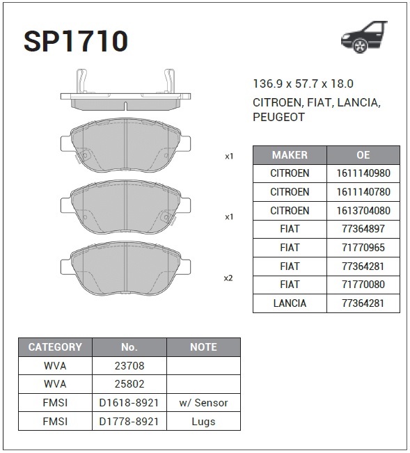 SP1710 SANGSIN Колодки тормозные дисковые Fiat Idea/Doblo, Peugeot 207 1.4i/1.3D-1.9JTD 01 SP17