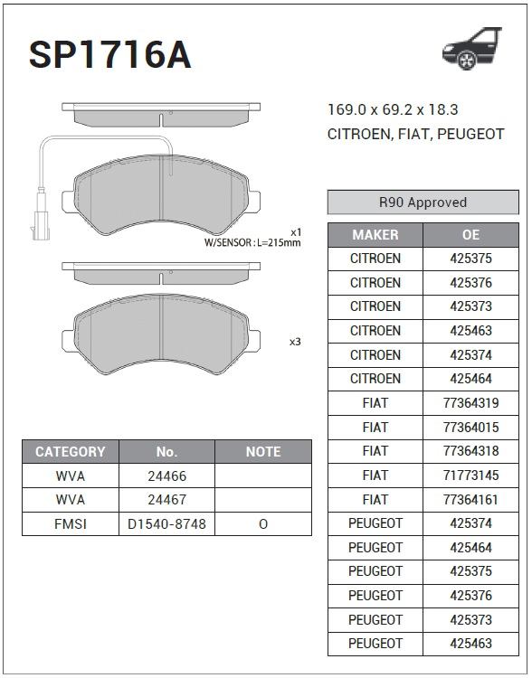 | Наименование | Колодки передние PEUGEOT BOXER, CITROEN JUMPER, FIAT DUCATO (250) 06- SP1716A |