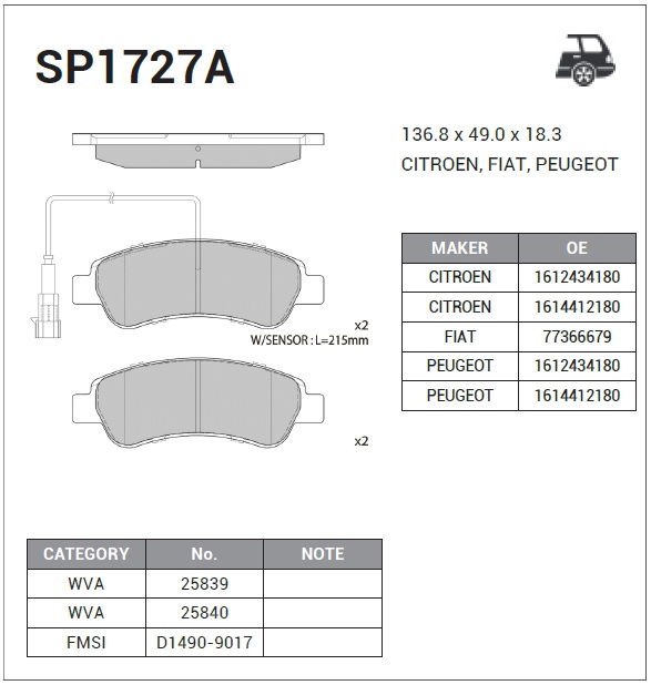 | Наименование | Колодки тормозные дисковые SP1727A |