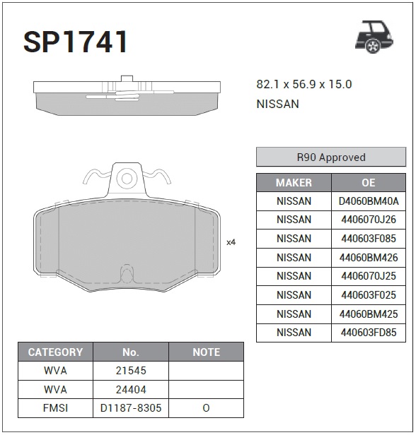 SP1741 SANGSIN Колодки тормозные NISSAN Almera (N16),Primera (P11) задние (4шт.) SANGSIN