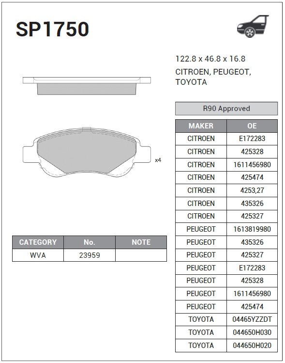 SP1750 SANGSIN Колодки тормозные PEUGEOT 107 CITROEN C1 TOYOTA Aygo (05-) передние (4шт.) SANGS