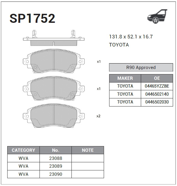 SP1752 SANGSIN Колодки тормозные дисковые Toyota Corolla 1.4i/1.6i/2.0D диск 14/15 с ABS 97-00
