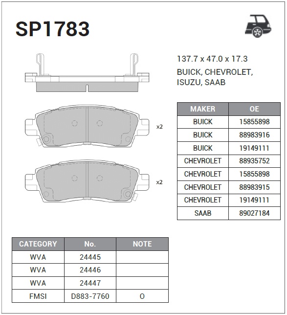 | Наименование | Колодки тормозные дисковые Chevrolet TrailBlazer, Saab 9-7 4.2-5.3i 02 SP1783 |