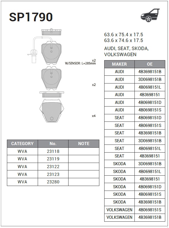 | Наименование | Колодки тормозные дисковые Audi Allroad 2.7i/2.5TDi 00 SP1790 |