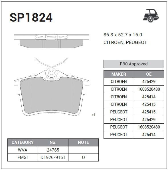 SP1824 SANGSIN Колодки тормозные CITROEN BERLINGO 08-/PEUGEOT 308 07-/PARTNER 08- задние SP1824