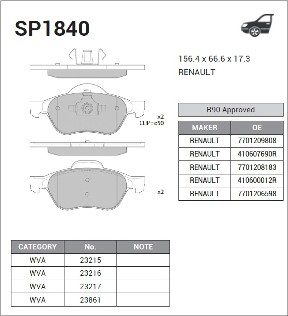 | Наименование | Колодки тормозные дисковые Renault Laguna II 1.6i/1.8i/1.9DCi 01 диск 15 SP1840 |