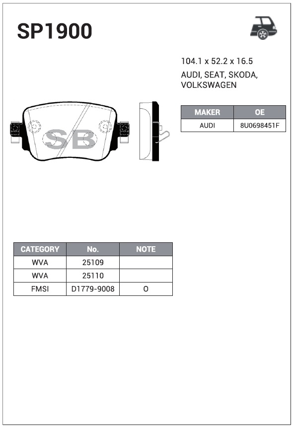 SP1900 SANGSIN Колодки тормозные дисковые Audi A1, Seat Leon, Skoda Octavia 1.0-2.0i/TDi 12 SP1