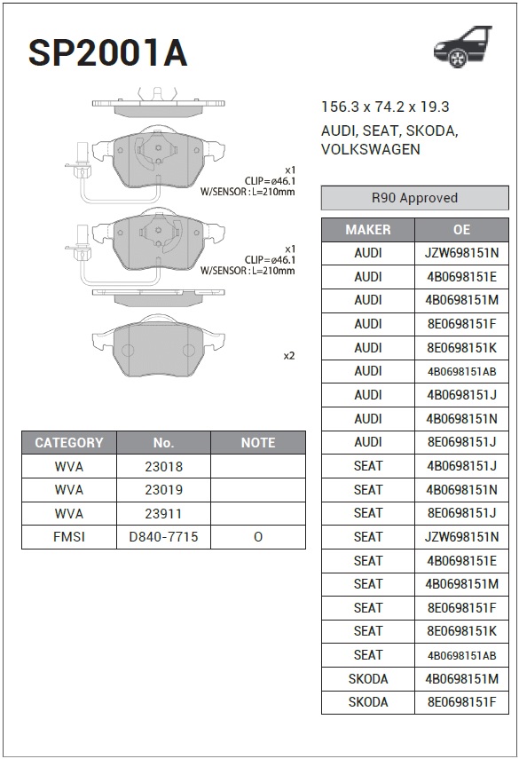| Наименование | Колодки тормозные А100 9194/А6 9597 передние SP2001A |