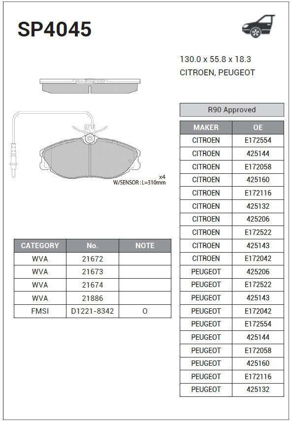 SP4045 SANGSIN Колодки тормозные PEUGEOT 306,406 передние (4шт.) SANGSIN