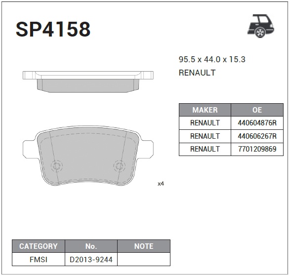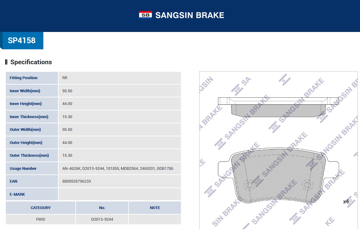 SP4158 SANGSIN Колодки тормозные RENAULT Kangoo (08-) задние (4шт.) SANGSIN