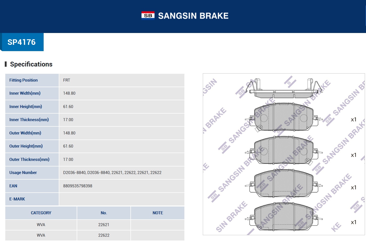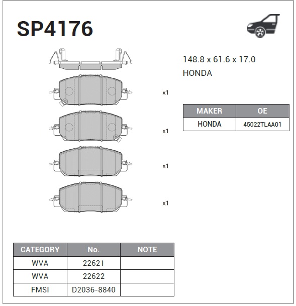 SP4176 SANGSIN Колодки тормозные HONDA CR-V (17-) передние (4шт.) SANGSIN
