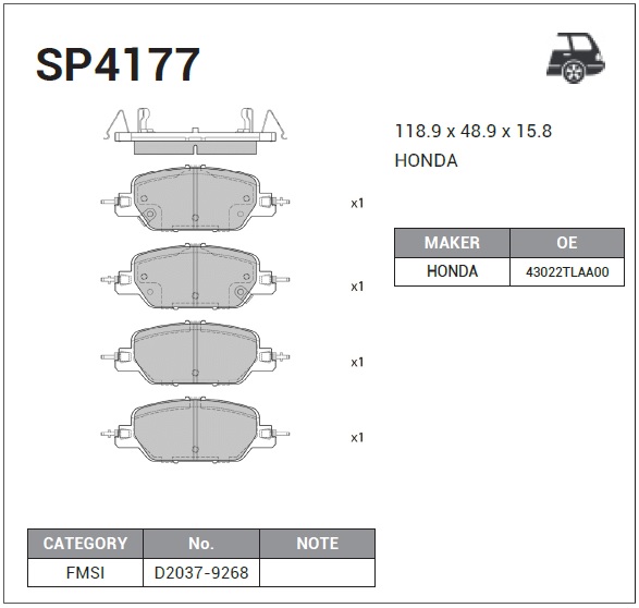 | Наименование | Колодки задние HONDA CR-V 2017- SP4177 |