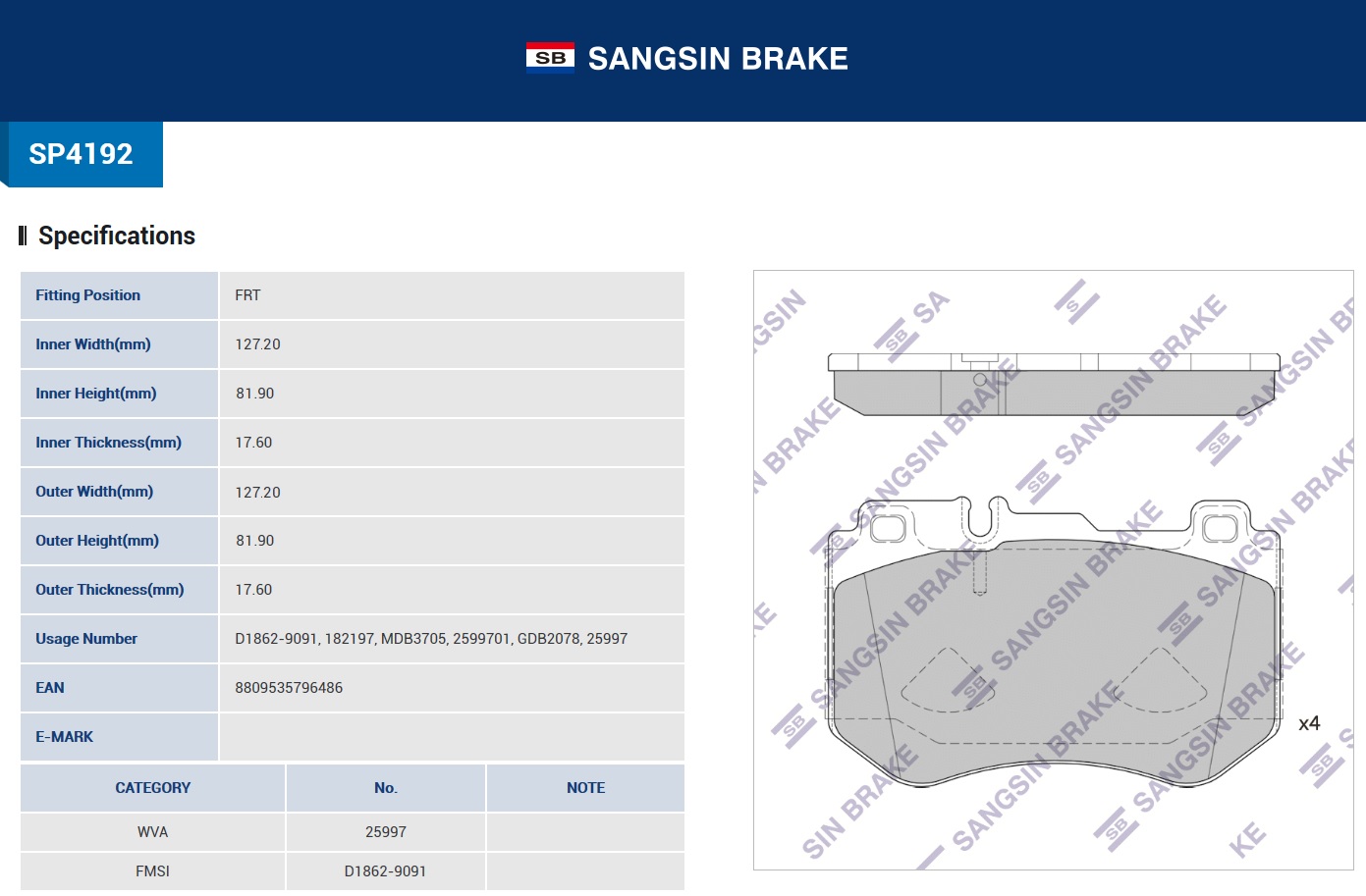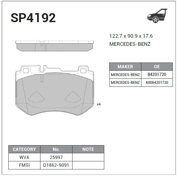 SP4192 SANGSIN Колодки тормозные MERCEDES C (W205) передние (4шт.) SANGSIN