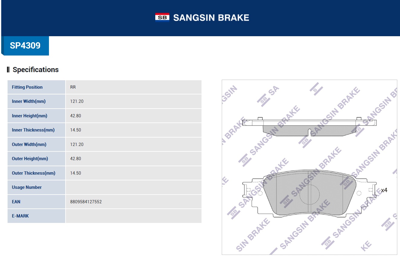 SP4309 SANGSIN Колодки тормозные LEXUS RX (15-) задние (4шт.) SANGSIN