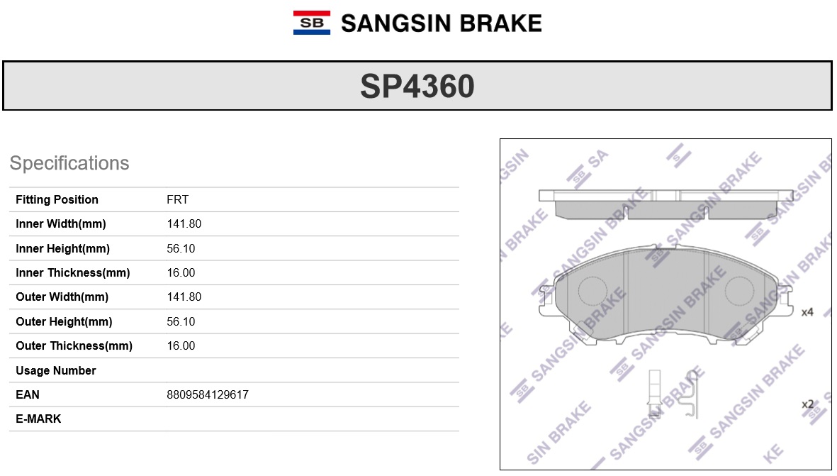 SP4360 SANGSIN Колодки тормозные SUZUKI SX4 (13-) передние (4шт.) SANGSIN