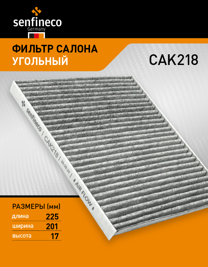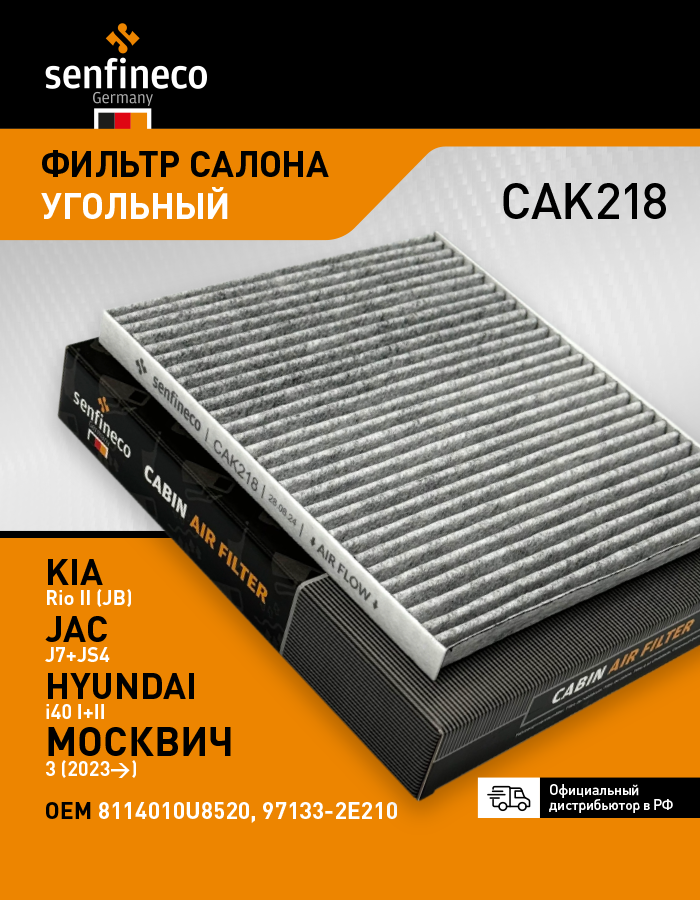 CAK218 SENFINECO Фильтр салонный угольный JAC J7 / JS4 / S3, МОСКВИЧ 3, KIA Carens II (FG), Cerat