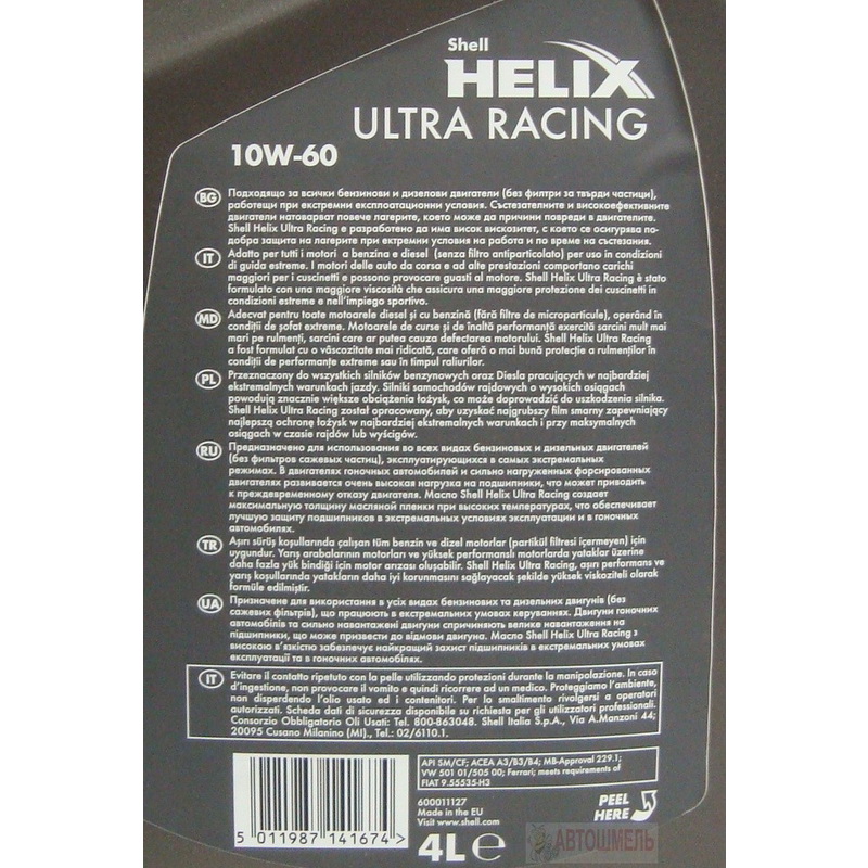 | Наименование | Масло моторное Shell Helix Ultra Racing 10w-60 4л. синт. |
