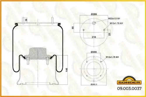 090030037 SONDER Пневморессора Premium со стаканом (металл) SAF 2 шпильки + 1 отв. воздух — 3 го