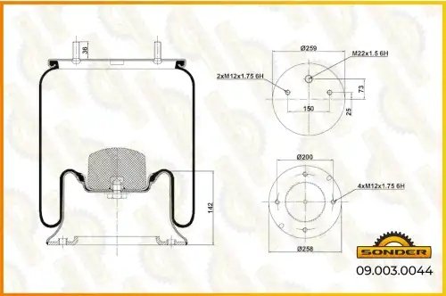 090030044 SONDER Пневморессора Premium со стаканом (металл) (2 шп. М12мм,1 отв. М22х1.5мм) — 3 го