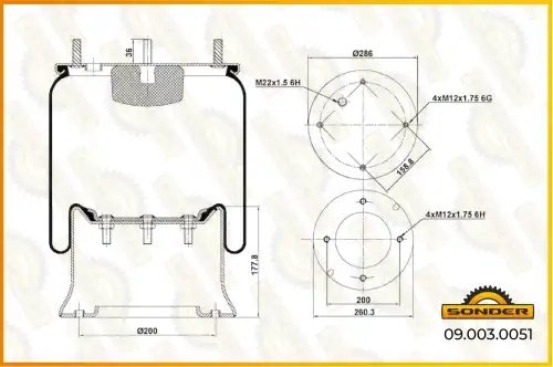 090030051 SONDER Пневморессора Premium со стаканом (металл) 4 шп.+возд. / 4 отв. 813 MB — 3 года