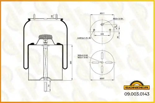 090030143 SONDER Пневморессора Premium со стаканом (металл) 2шп.M12. 1отв-шт.M22 низ: 1шп. M22 6